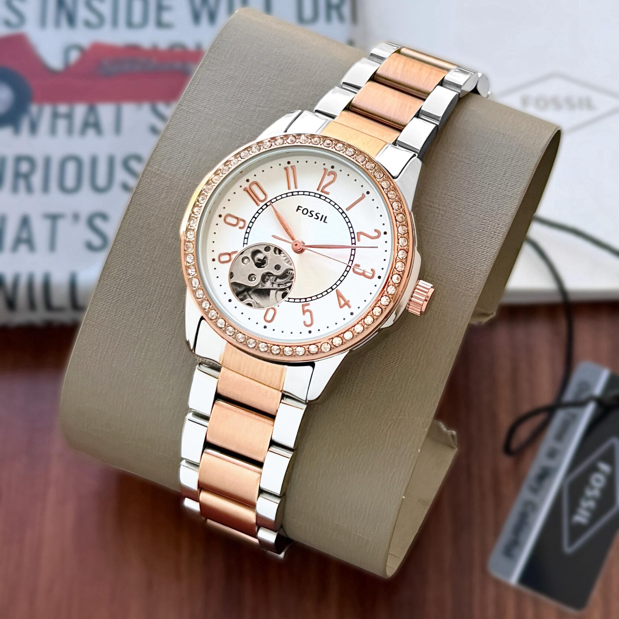 The Fossil ME3058 is a stylish automatic watch from Architect collection — known for its elegant skeleton design and timeless detailing.⌚